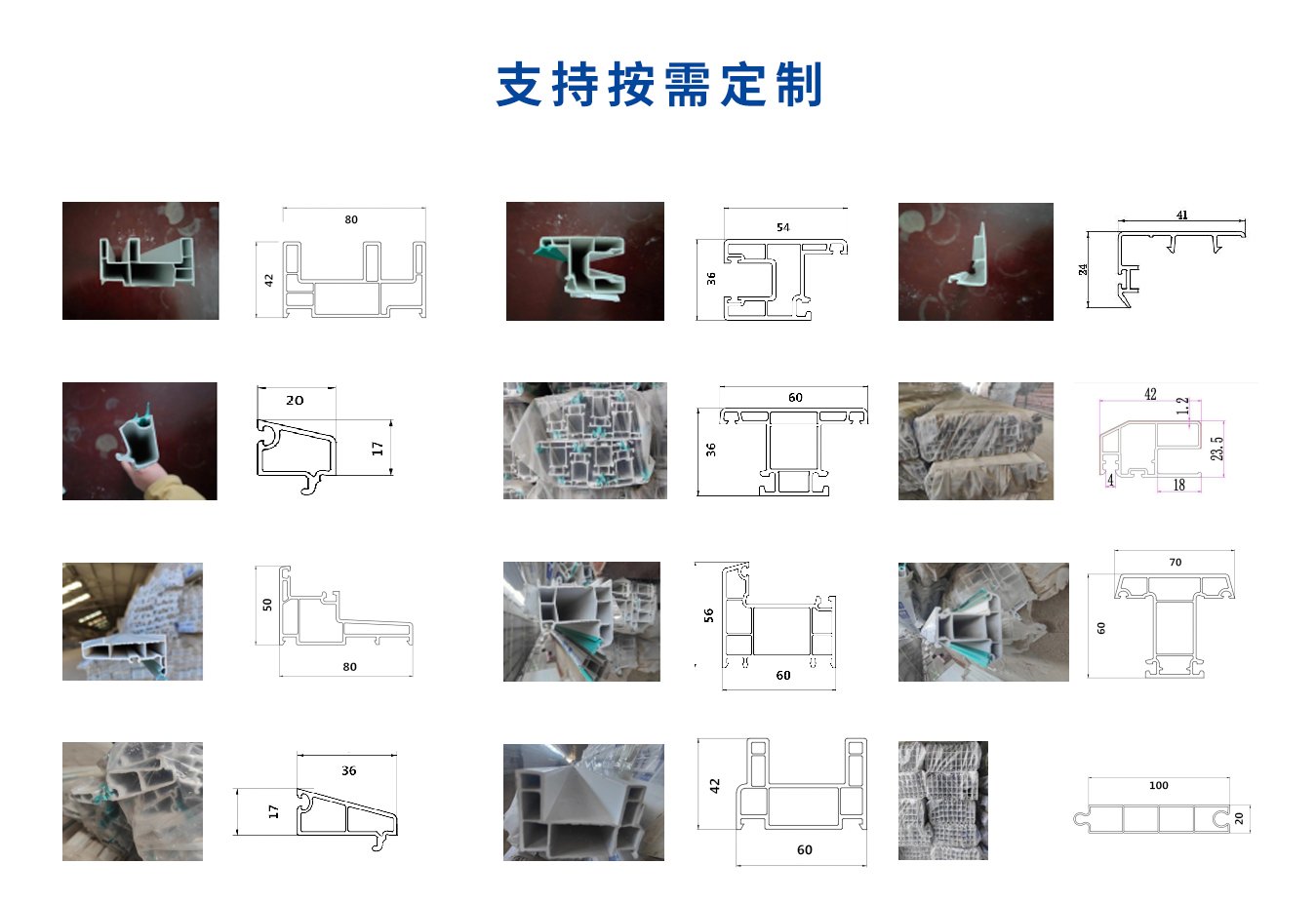 PVC異型材模具:PVC塑鋼門窗、平開門窗、推拉門窗、護(hù)欄、線槽等。